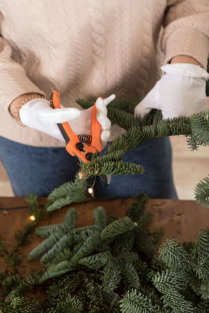 DIY Christmas composition from nobilis. Wreath decor for holiday decorations. Girls at a workshop on making floristry from tree branches