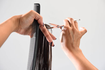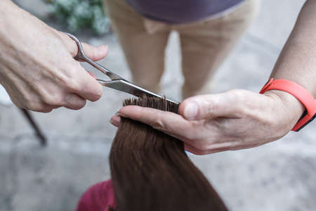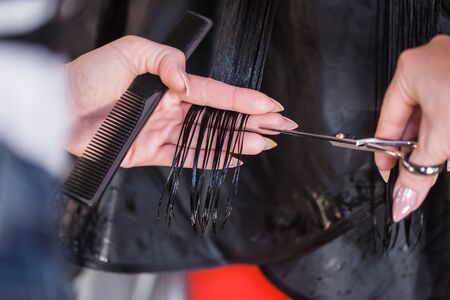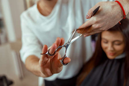 Close up of hairdresser hands cutting brown hair at home. Professional stylist trimming hair split ends.