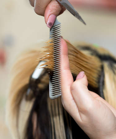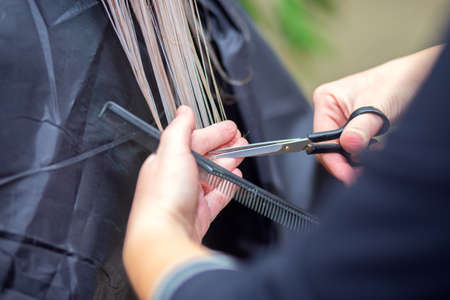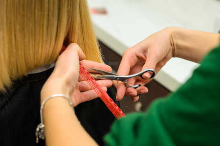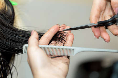 Closeup macro shot image of hairstylist hairdresser cutting customer woman hair in salon with scissors and comb, look from behind back side