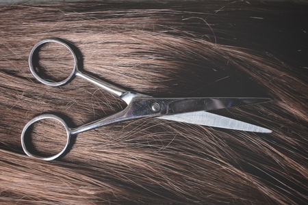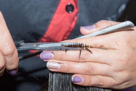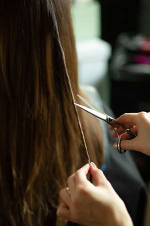 Hands with scissors cut a strand of someone elses brunette hair in beauty salon