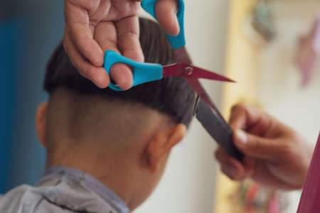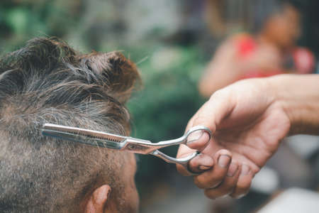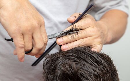 Hairdresser cutting client's hair in beauty salon. Beauty concept. Close up