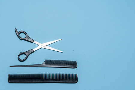 Hair styling and cutting kit such as combs, razor and scissors arranged on a blue background