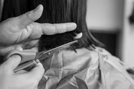 Close up of a hairdresser cutting the hair of a woman, selective focus