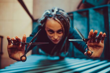 woman hairdresser with dreadlocks holding scissors in hand close-up