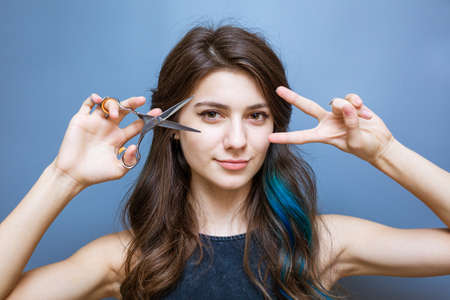 Cute young woman with brunette with blue strands of hair holding scissors near her face posing isolated on blue studio background. Beauty and hair care concept