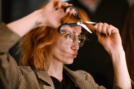 Woman playfully posing with scissors while showing off her stylish haircut in a creative space during daytime