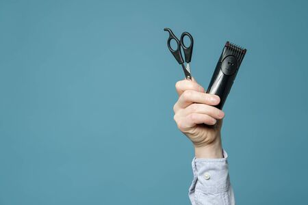 Male hand holds a hairdressing scissors and cordless trimmer. Studio, blue background. Copy space.