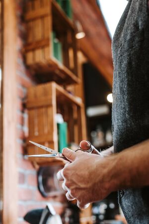 barber male hand accurate holding hairdresser scissors. Barber professional tools.