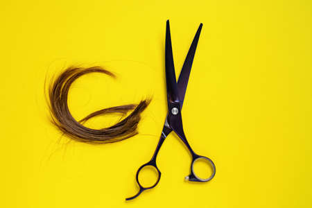 Curly strand of brown hair with scissor setting on bright yellow background. Studio, isolated, copy space.