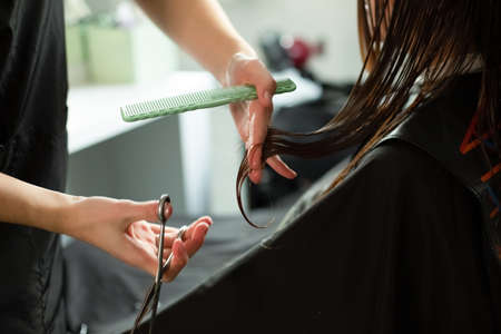 womens haircut in a Barber shop. Master universal cuts, evens the girls hair with a comb and scissors
