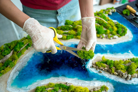 Hands of young creative man with polished nails cutting out photo with vase while going to make art composition or collage
