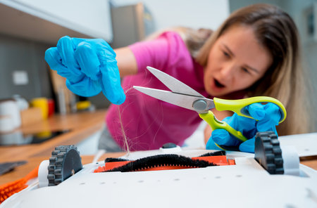 A young woman cleans a robot vacuum cleaner from dirt after cleaning.