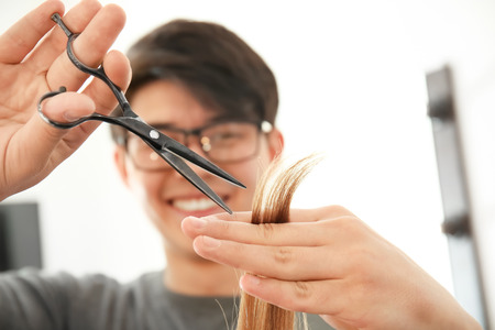 Young male Asian hairdresser concentrating on work while cutting and trimming long and beautiful hair of female customer in modern salon