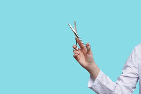 Close up Unrecognizable female surgeon holds needle holder in her hand. Doctor shows how to hold instrument correctly.