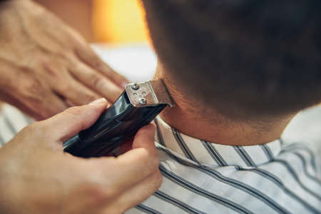 Close-up photo of electric trimmer in hands of a skilled barber cutting hair of a man