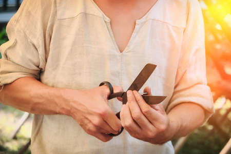 Sharp scissors with black and red arms in a male hand. Small stationery scissors in the left hand. Middle-aged man of European race. Stationery