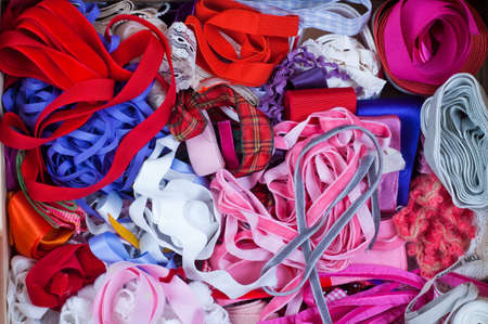 Close-up view of a large pile of fabrics, stacked high, showing a wide array of colors and textures. The fabrics are in various styles, with some displaying ruffles and patterns.