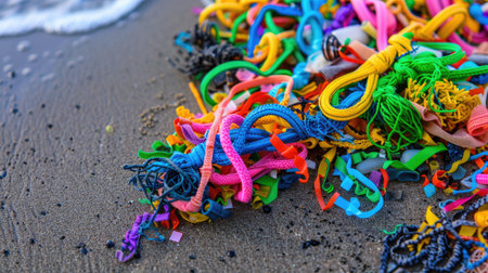 A vivid array of colorful plastic debris scattered along a beach shoreline, highlighting environmental pollution and waste issues. The ocean waves gently lap the sand.