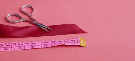 Sewing supplies. Red ribbon, scissors and sartorial meter close-up on red background