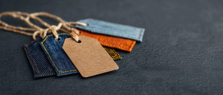 A collection of clothing tags in various colors and materials arranged creatively, perfect for fashion and retail presentations.
