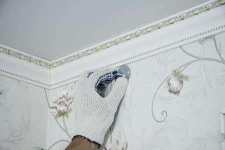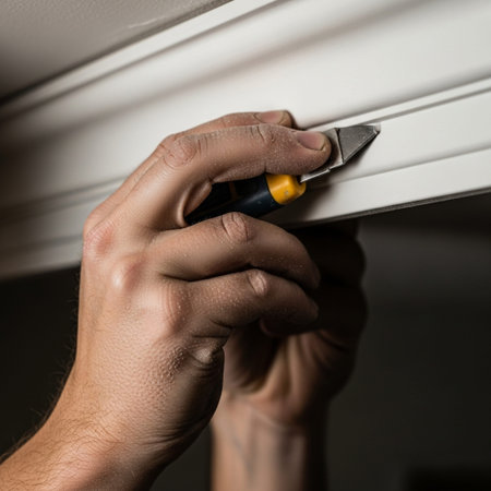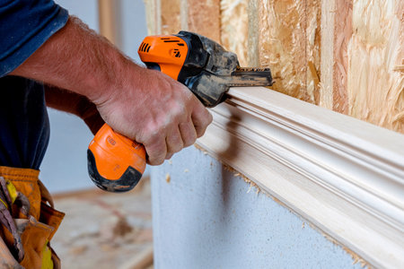 Skilled hands work meticulously to install elegant trim along the wall, enhancing the interior of a updated living space. The atmosphere reflects dedication to craftsmanship and warmth.