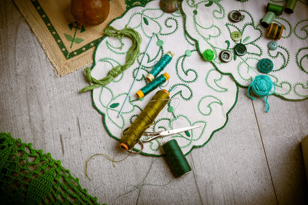 Set of sewing and embroidery supplies on a table: sewing thread, buttons, crochet, embroidered doiles, scissors. Retro effect