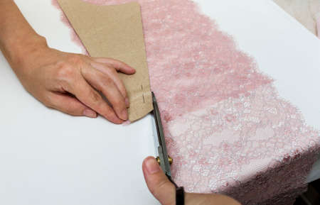 Women's hands cut out lace underwear on a table. Close-up