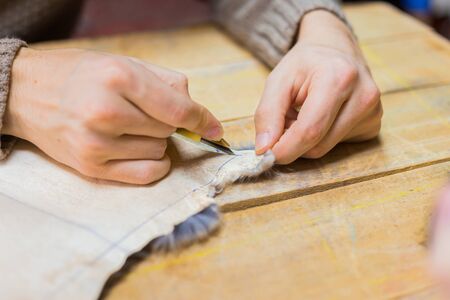 Professional male skinner, furrier working with mink fur skin at atelier, workshop. Fashion and leatherwork concept