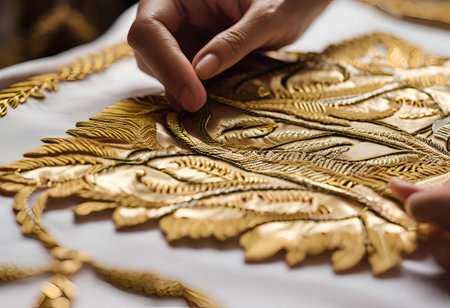 Intricate patterns embroidered on fabric with rare, luxurious gold thread, creating a beautiful, elegant design.AI Generated