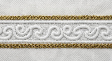 A close-up view of a decorative trim featuring a white scroll pattern bordered by gold braided cords on a textured white background.