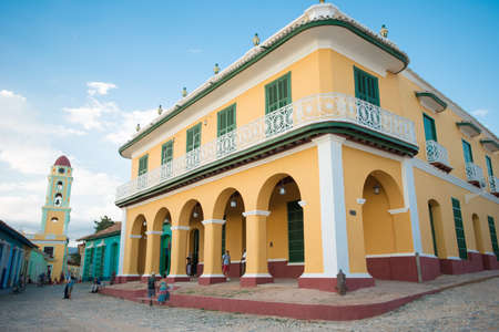 TRINIDAD, CUBA - FEBRUARY 25, 2014: Panoramic view to huge yellow ancient house with columns, narrow streets, local buildings, central square and main chapel behind in the city center at summer sunny day
