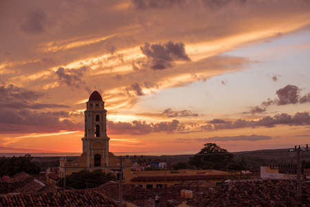 TRINIDAD, CUBA - OCTOBER 30, 2014: Bird's-eye panoramic view around roofs of ancient houses, narrow streets, local buildings and main yellow chapel in the city center at sunset. Beautiful evening glow of clouds in the sky