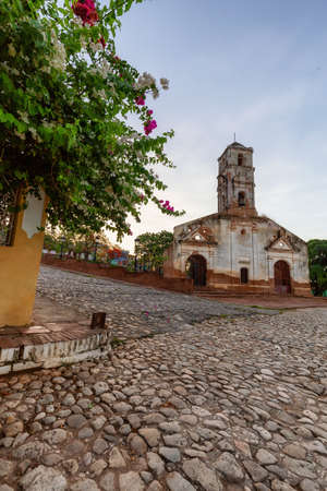 Beautiful View of a Church in a small touristic Cuban Town during a vibrant sunny and cloudy evening before sunset. Taken in Trinidad, Cuba.