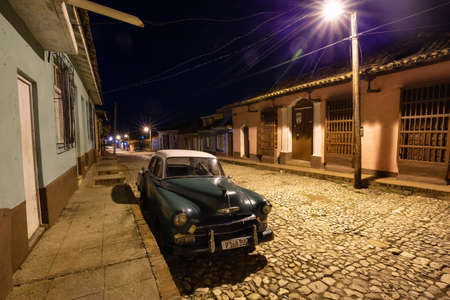 Trinidad, Cuba - June 9, 2019: View of an Old Classic American Car in the streets of a small Cuban Town during dark night time.