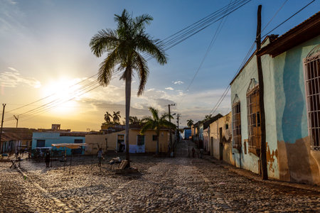 TRINIDAD, CUBA - JANUARY 4, 2017: Tropical sunset in a colonial street. Urban scene in Colonial town cityscape of Trinidad, Cuba.
