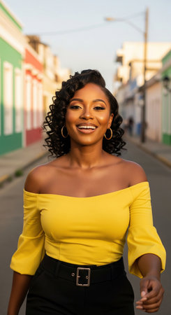 A portrait of a happy young African woman walking on a colorful street. She is smiling at the camera during a beautiful sunset.