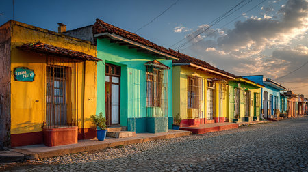 Street view of a Residential neighborhood in a small Cuban Town during a cloudy and sunny sunrise. Taken in Trinidad, Cuba.