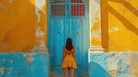 An inviting courtyard scene features colorful buildings and palm trees under a bright sky. The composition showcases architectural details, textures, and a warm color palette. This image is suitable for various commercial uses, including travel, lifestyle, and design projects. The lighting suggests a bright day.