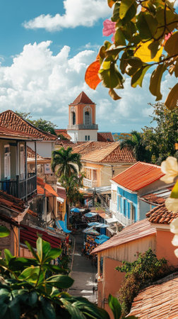 A view down a narrow street in a colonial town. The street is lined with colorful, yellow buildings. In the distance, a tall church bell tower stands tall against a backdrop of blue sky and white clouds. Green trees line the street, creating a sense of peace and tranquility.