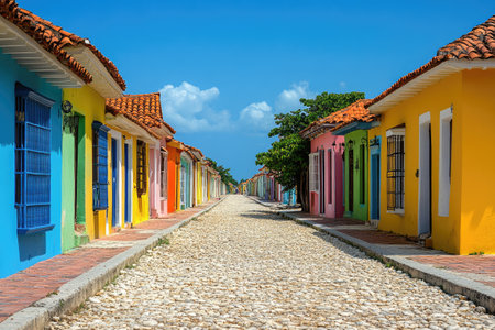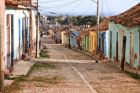 Trinidad, Cuba - June 08, 2019: Panoramic Street View of a small Cuban Town during a vibrant sunny day.
