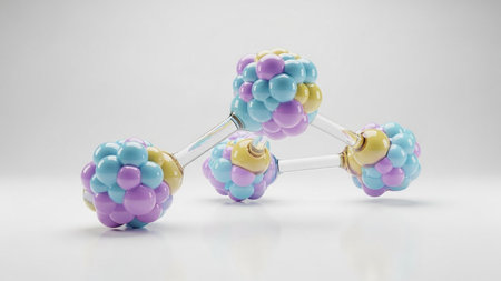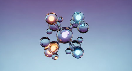 This abstract image captures the intricate beauty of a molecular structure with glass-like spheres, reflecting colorful shades in a modern design.