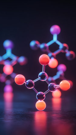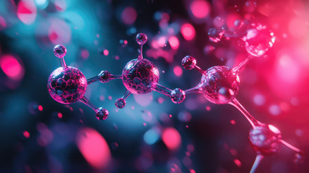 Vibrant molecular structure showcasing interconnected atoms with glowing colors. Perfect for science, chemistry, and technology-related projects or educational content.