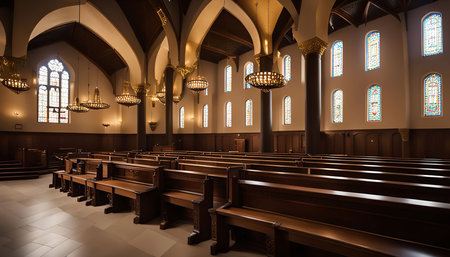 A wide shot of a church interior featuring rows of wooden pews, stained glass windows, and ornate chandeliers. The space is filled with natural light, creating a serene and peaceful atmosphere.