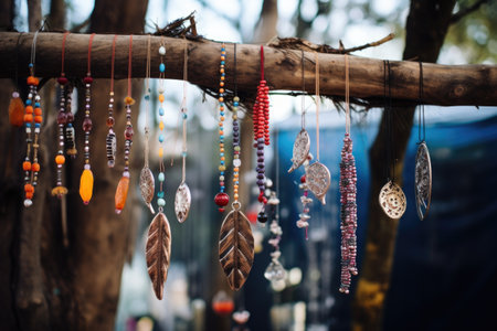 A closeup image of vibrant handmade jewelry featuring intricate designs and colorful beads, creating a unique and artistic display in a lively market.