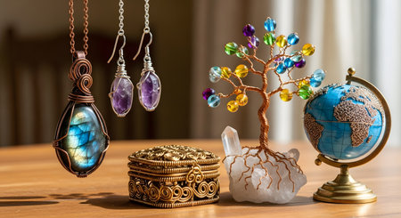 A beautiful still life arrangement of handmade crafts on a wooden table, including wire-wrapped jewelry like a labradorite pendant and amethyst earrings, a crystal tree of life, and a small globe. This collection represents artisan skill, new age spirituality, and creative hobbies.