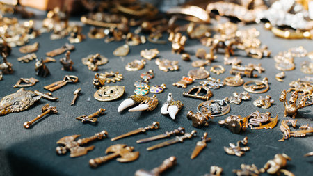 Bronze jewelry, medieval amulets and handmade souvenirs sold outdoors. Selective focus, close-up.