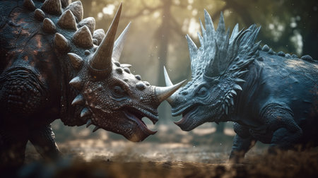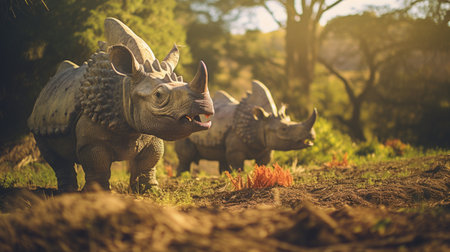 View of the giant triceratops dinosaurs in an ancient environment. Ancient creatures in their natural habitat. Prehistoric natural landscape with dinosaurs