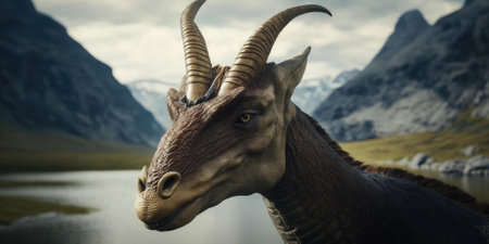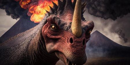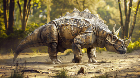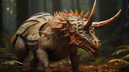 the styracosaurus, a rare and fascinating dinosaur, is depicted in this stunning image, boasting an extraordinary scorpion-like tail, blending the ancient creature's distinctive frill and spikes with the menacing features of a scorpion, creating a mesmerizing and fictional prehistoric hybrid. ai generated
