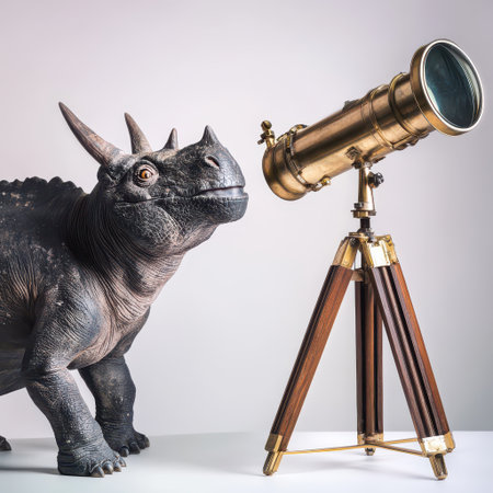 A dinosaur examines a vintage telescope in a studio setting showcasing an imaginative blend of past and present elements.
