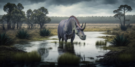 A realistic illustration of a Triceratops standing by a river in a prehistoric forest